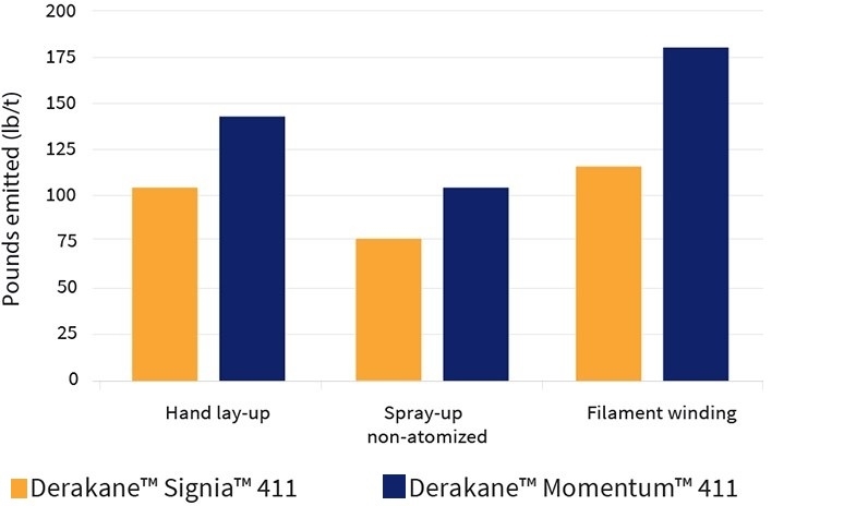 Сравнение уровня эмиссии стирола смол линейки Derakane™ для процедур ручного формования (hand lay-up), напыления (spray-up) и филаментной намотки (filament winding) в фунтах